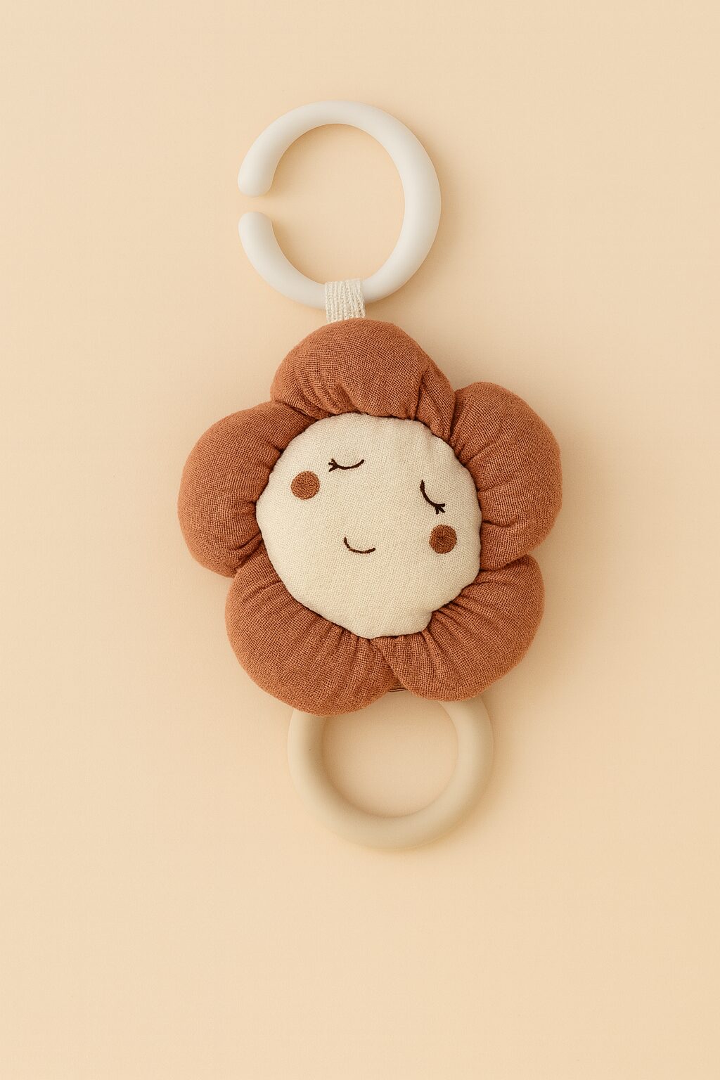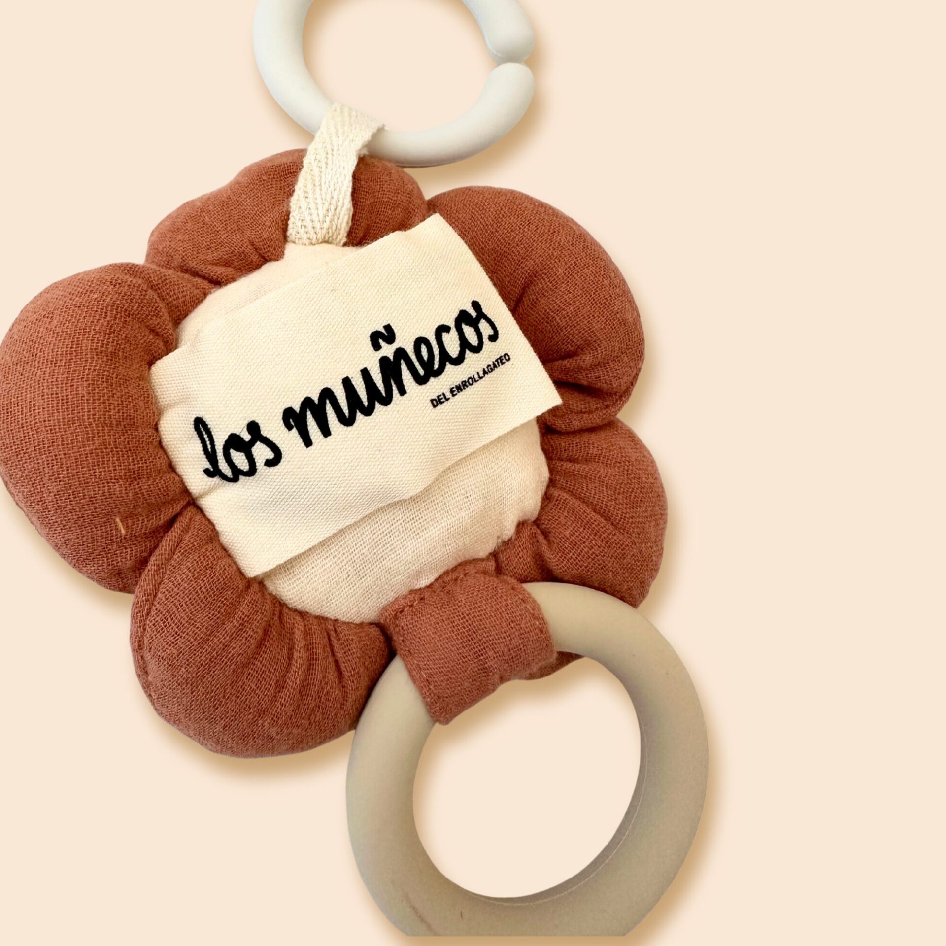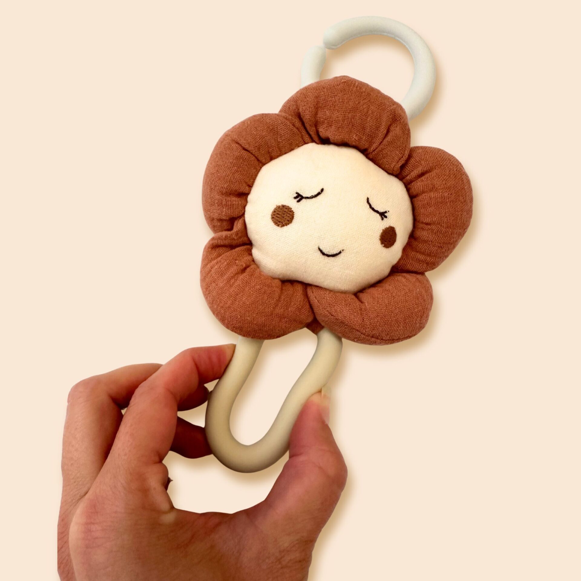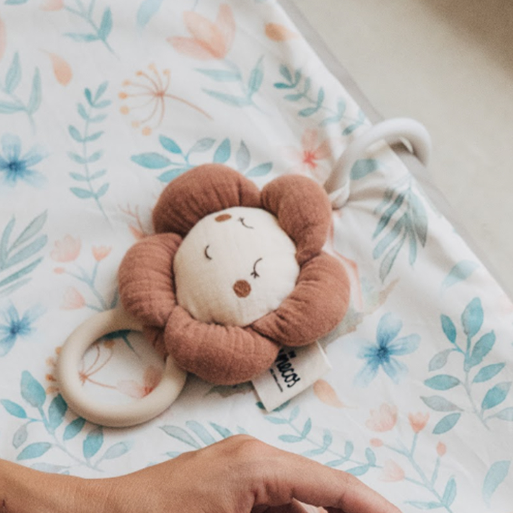 Una flor delicada y sonriente, perfecta para acompañar al bebé en sus primeros descubrimientos. Su textura ligera de muselina, junto con el mordedor y el sonajero, hacen que siempre haya algo nuevo que explorar.