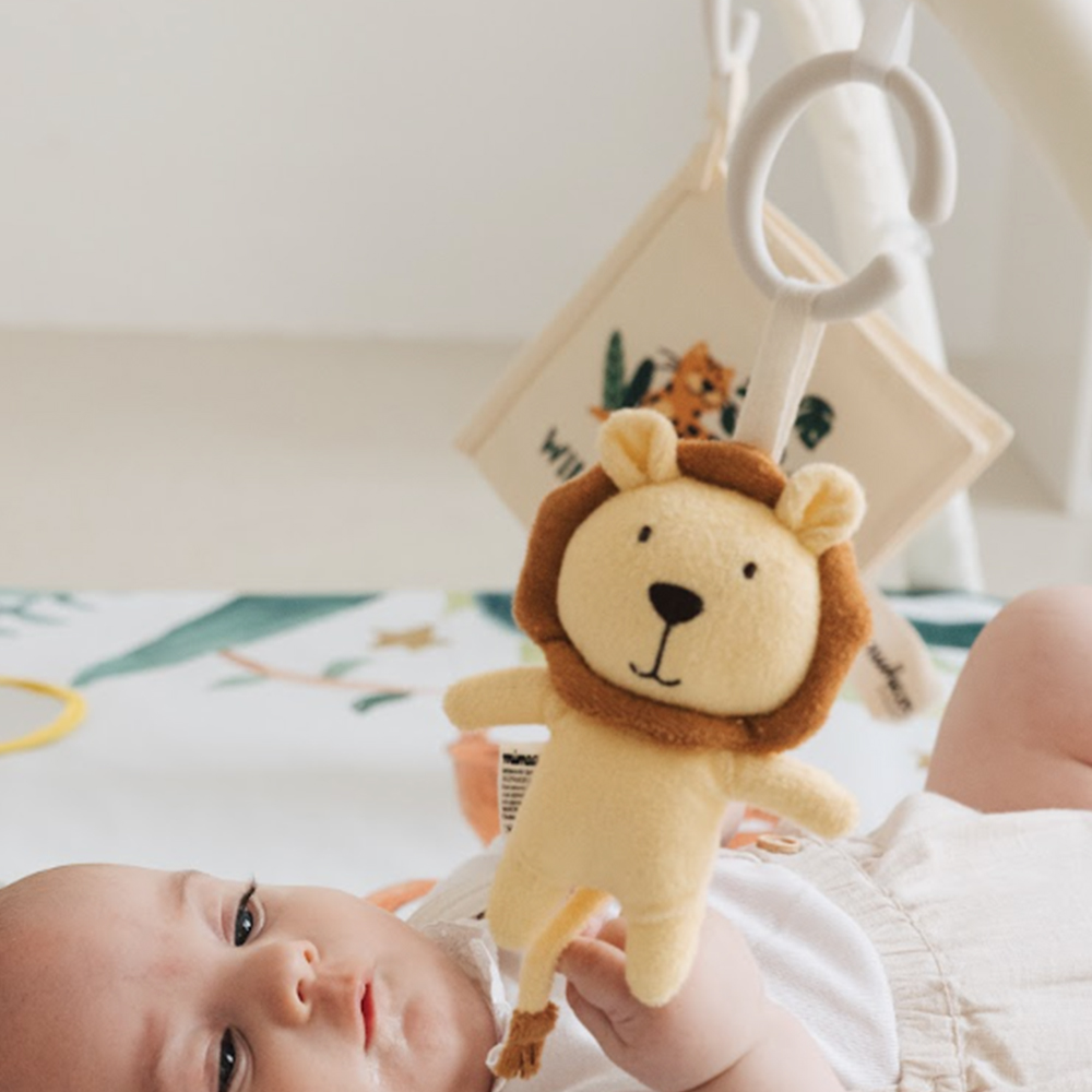 El rey de la selva en versión blandita. Su melena y su sonajero interno convierten cada juego en una experiencia alegre y estimulante.