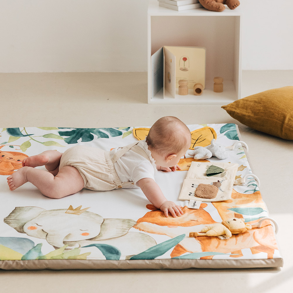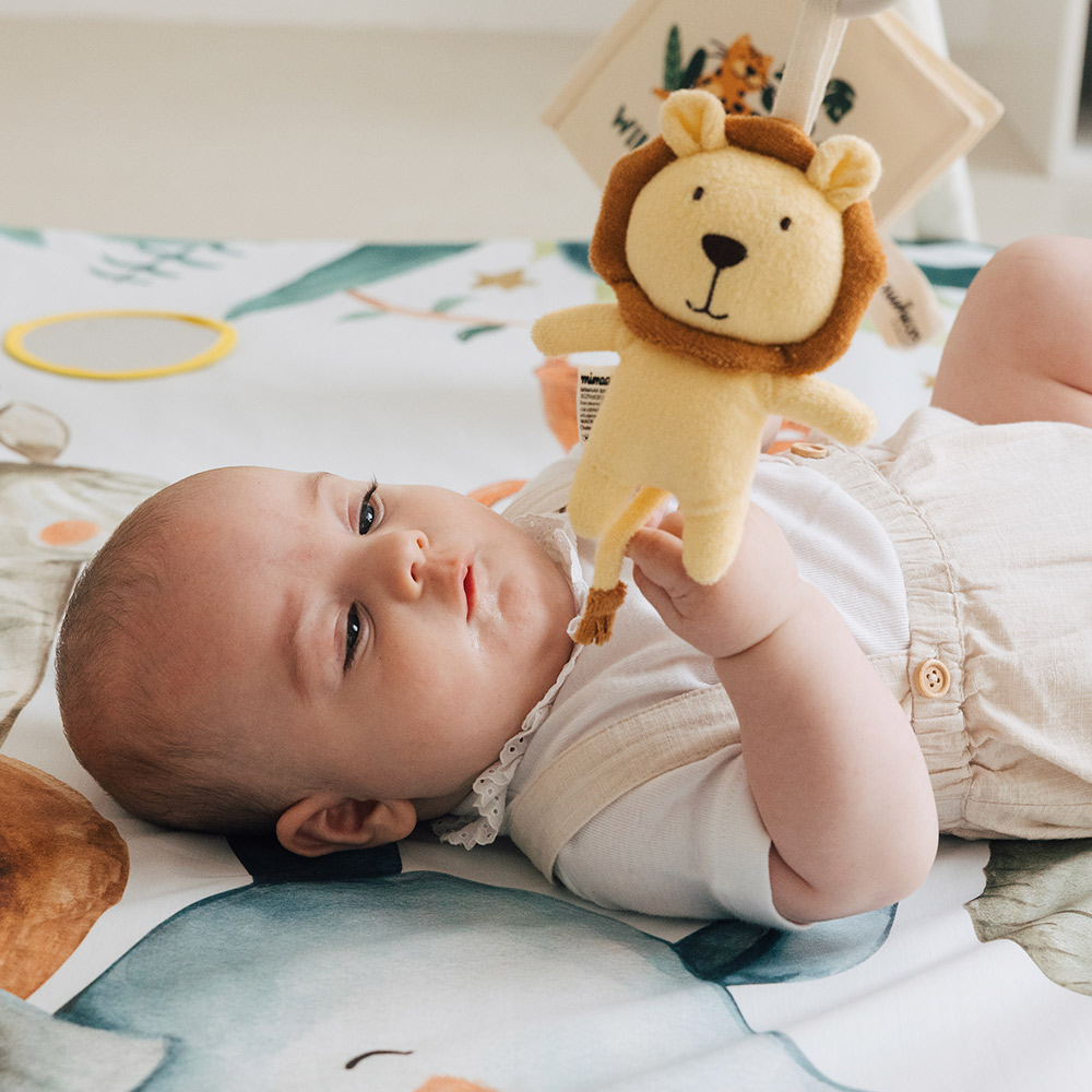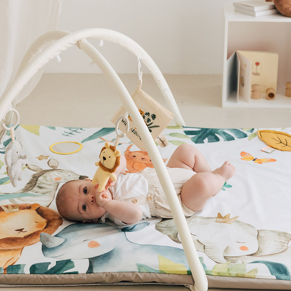 El Enrollagateo Maxi Safari destaca por su tamaño generoso, ofreciendo más libertad de movimiento para el gateo y el juego en el suelo. Combinado con el arco de juego y tres muñecos sensoriales, crea un entorno completo que acompaña al bebé desde los primeros meses hasta etapas más avanzadas.