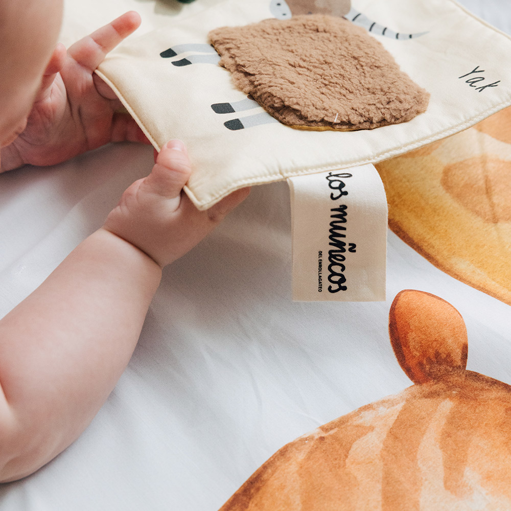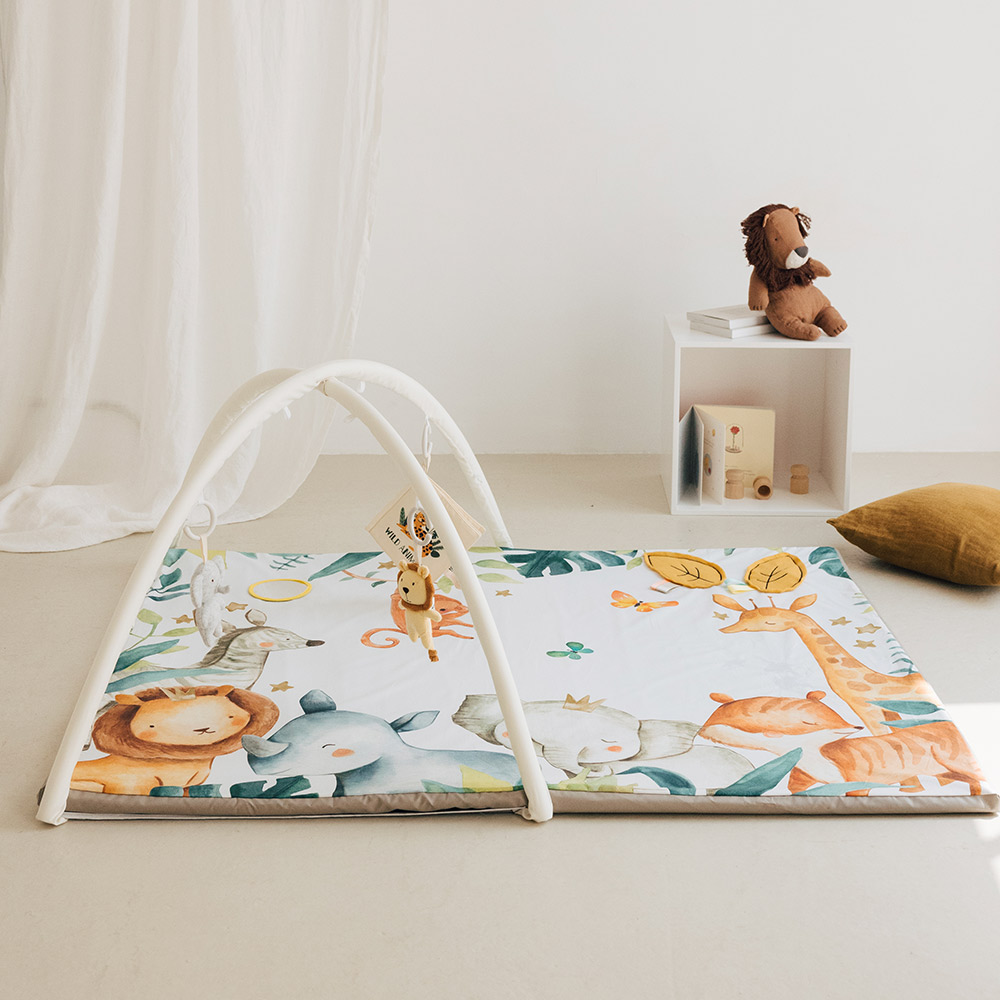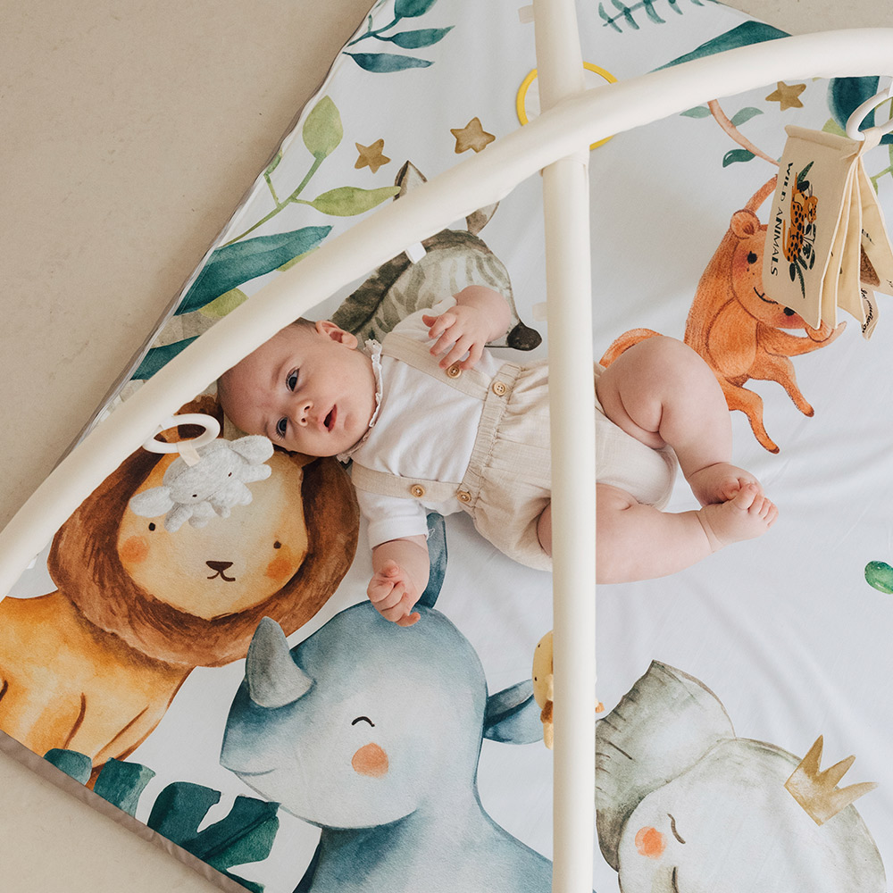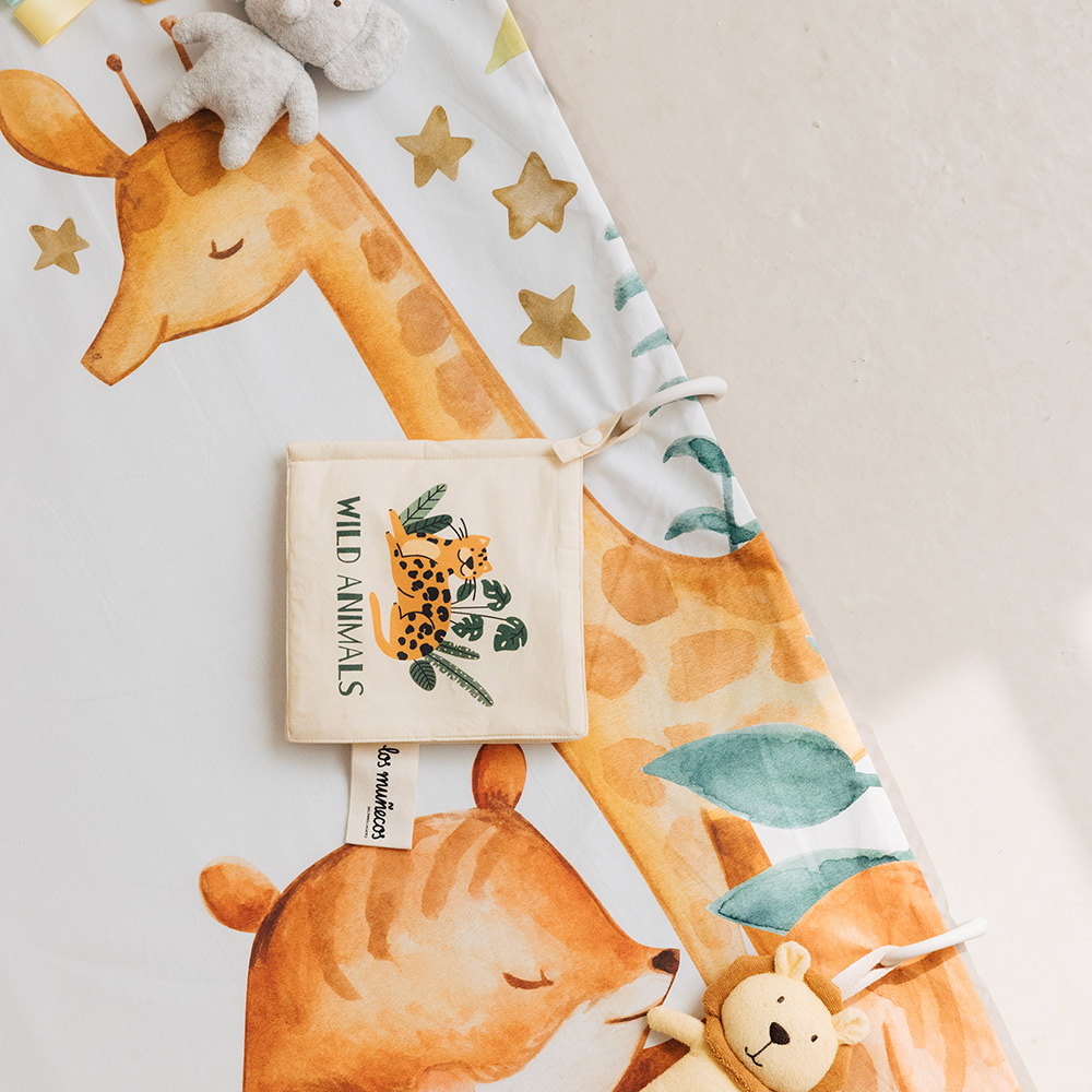 El Enrollagateo Maxi Safari destaca por su tamaño generoso, ofreciendo más libertad de movimiento para el gateo y el juego en el suelo. Combinado con el arco de juego y tres muñecos sensoriales, crea un entorno completo que acompaña al bebé desde los primeros meses hasta etapas más avanzadas.